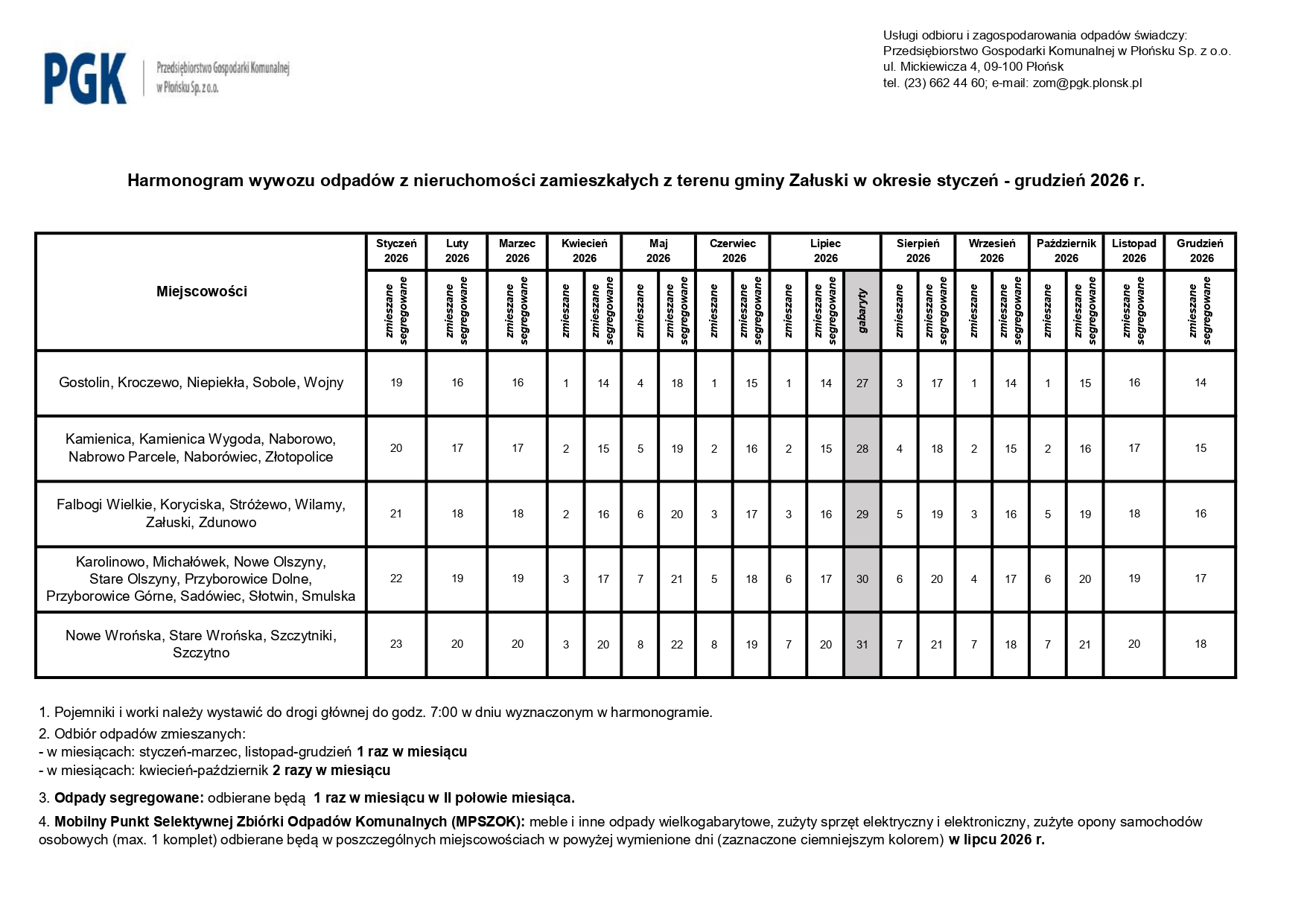 Harmonogram wywozu odpadów z nieruchomości zamieszkałych z terenu gminy Załuski w okresie styczeń - grudzień 2026 r.