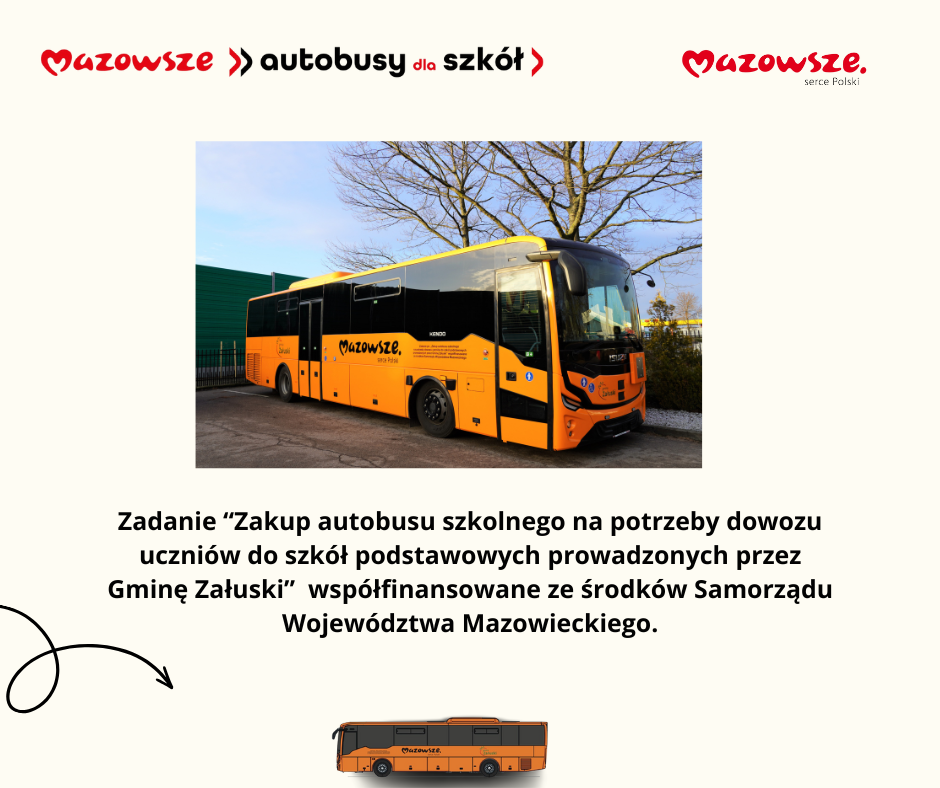Zadanie “Zakup autobusu szkolnego na potrzeby dowozu uczniów do szkół podstawowych prowadzonych przez Gminę Załuski” współfinansowane ze środków Samorządu Województwa Mazowieckiego.