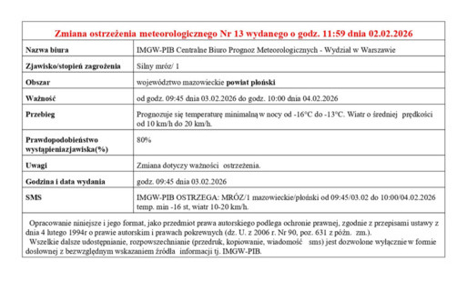 Ostrzeżenie meteorologiczne Nr 14 - opady marzące od godz. 22:00 dnia 04.02.2026 do godz. 23:00 dnia 05.02.2026