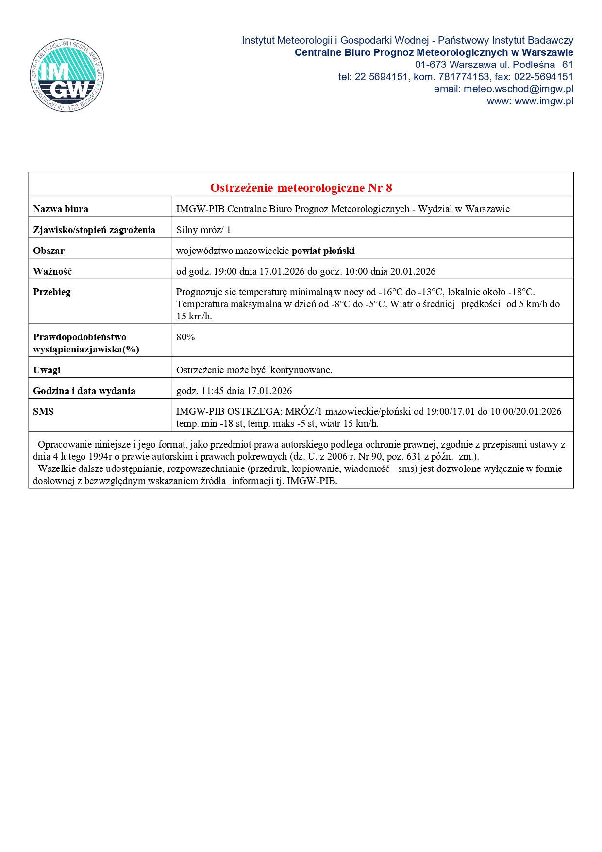 Ostrzeżenie meteorologiczne Nr 8 - silny mróz od godz. 19:00 dnia 17.01.2026 do godz. 10:00 dnia 20.01.2026