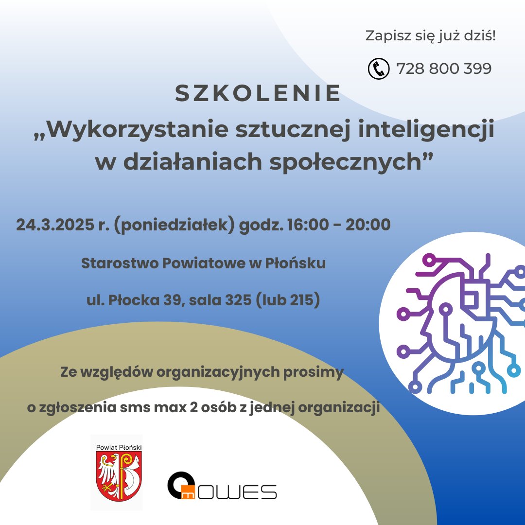 Starostwo Powiatowe w Płońsku zaprasza przedstawicieli organizacji pozarządowych na szkolenie pt. ,,Wykorzystanie sztucznej inteligencji w działaniach społecznych” 24 marca 2025 r.