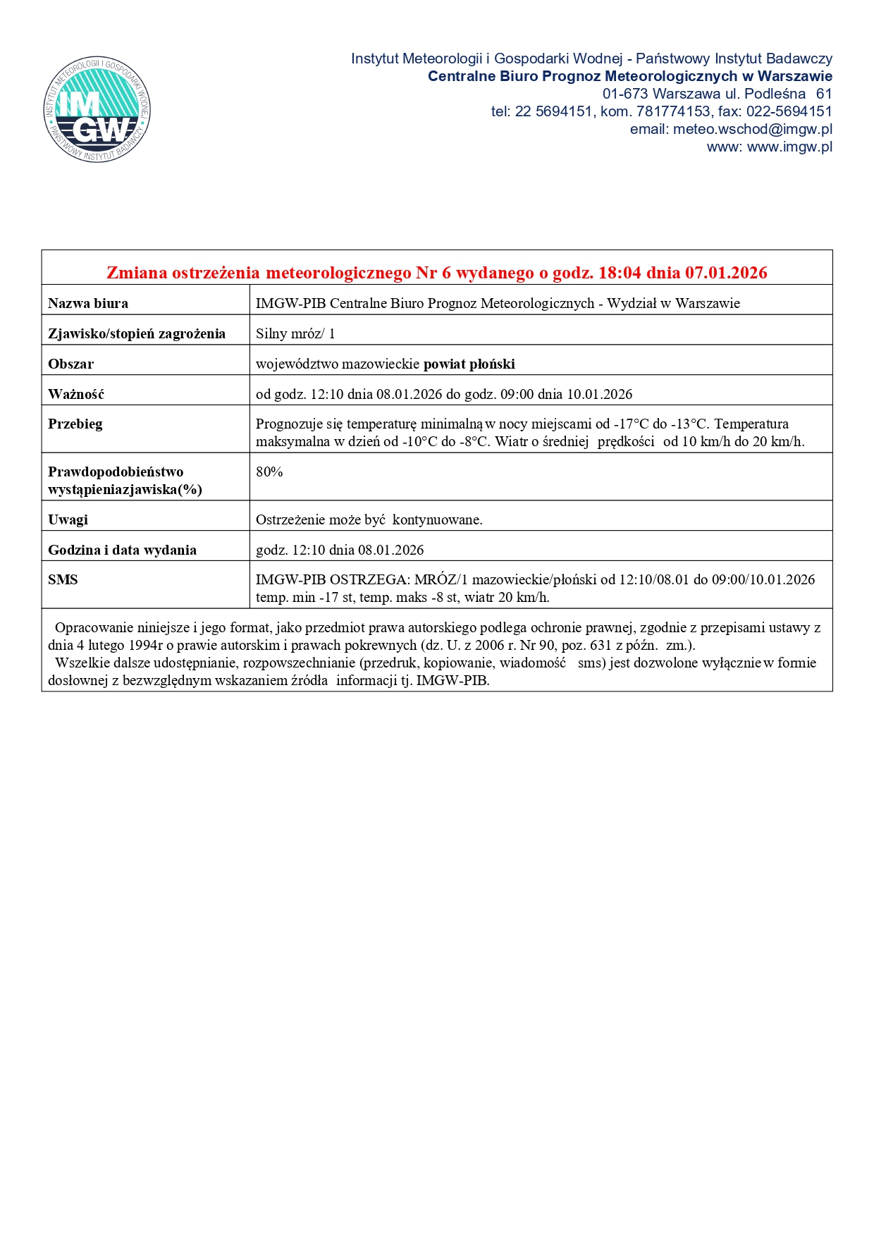 Zmiana ostrzeżenia meteorologicznego Nr 6 wydanego o godz. 18:04 dnia 07.01.2026